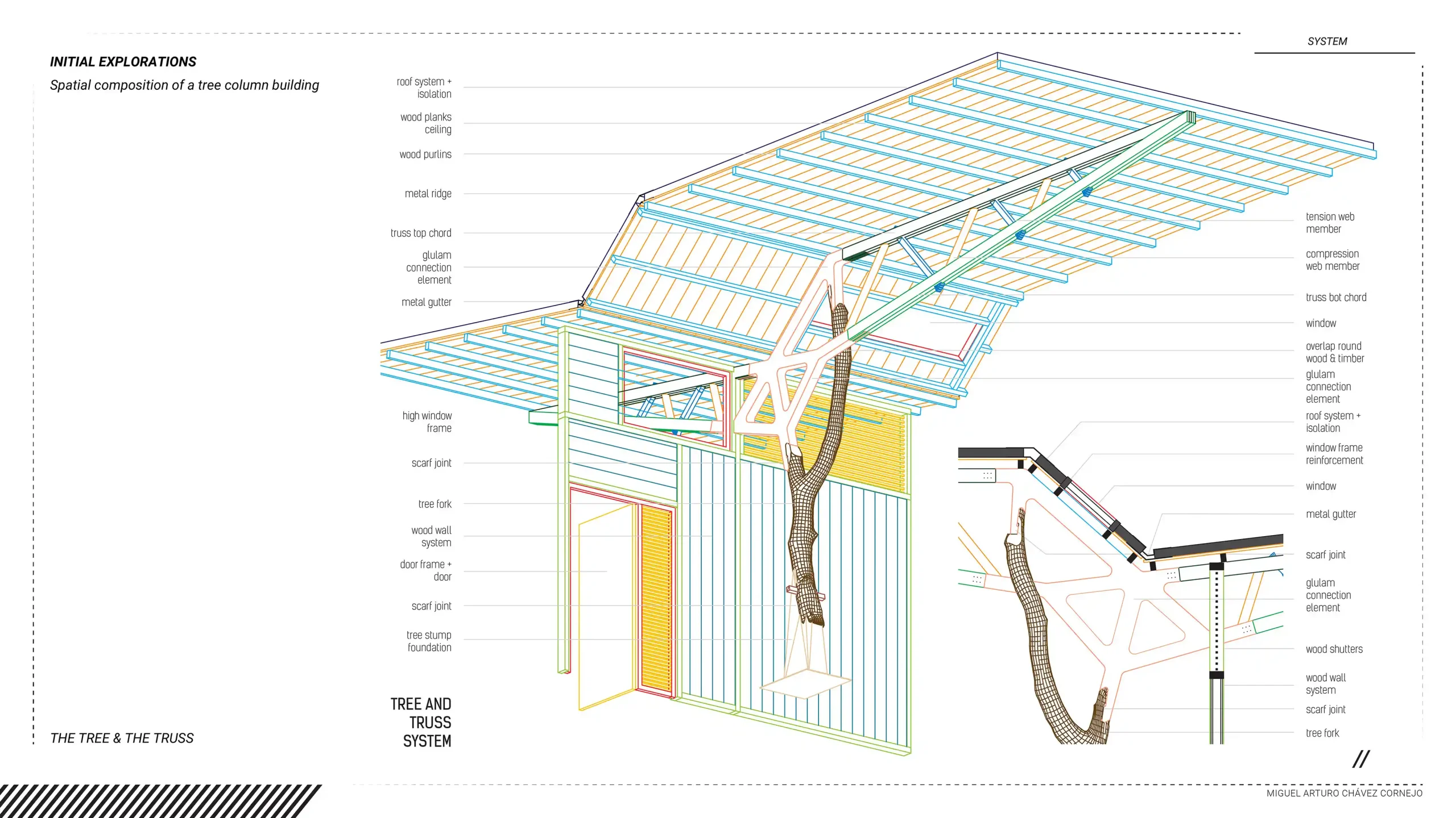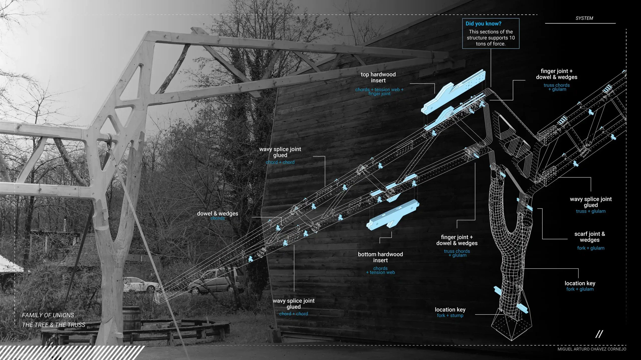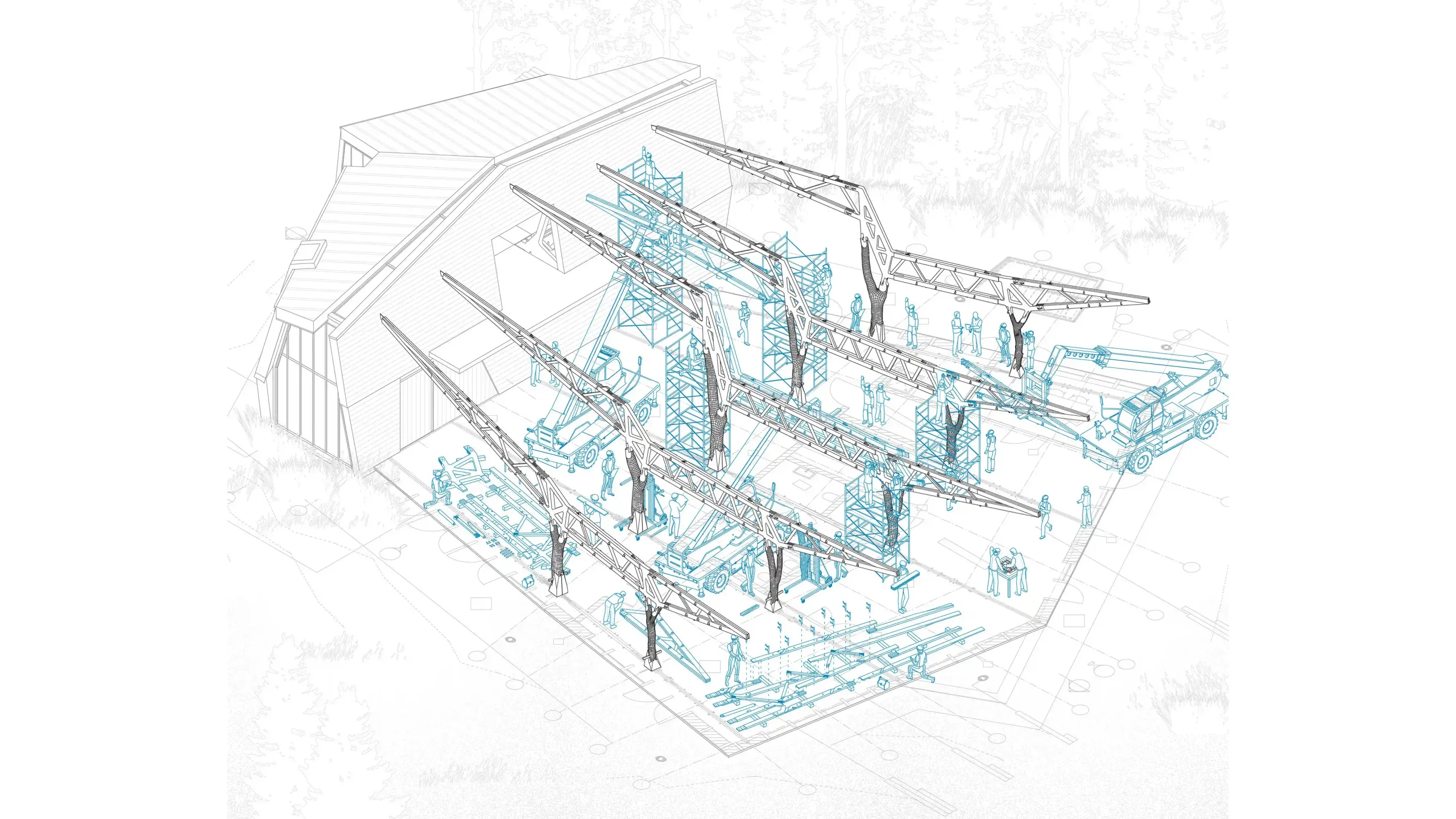 Wakeford Hall is a flagship building for the Architectural Association's Hooke Park campus. It will house a library, studios, a lecture hall and administrative spaces. This phase of the project was the load-bearing structure for a larger roof canopy, under which these programs are located. During the course of one academic year, we worked with students to design and fabricate a series of demountable large span trusses using only timber to timber connections. Drawings and images are courtesy of the Design + Make program.